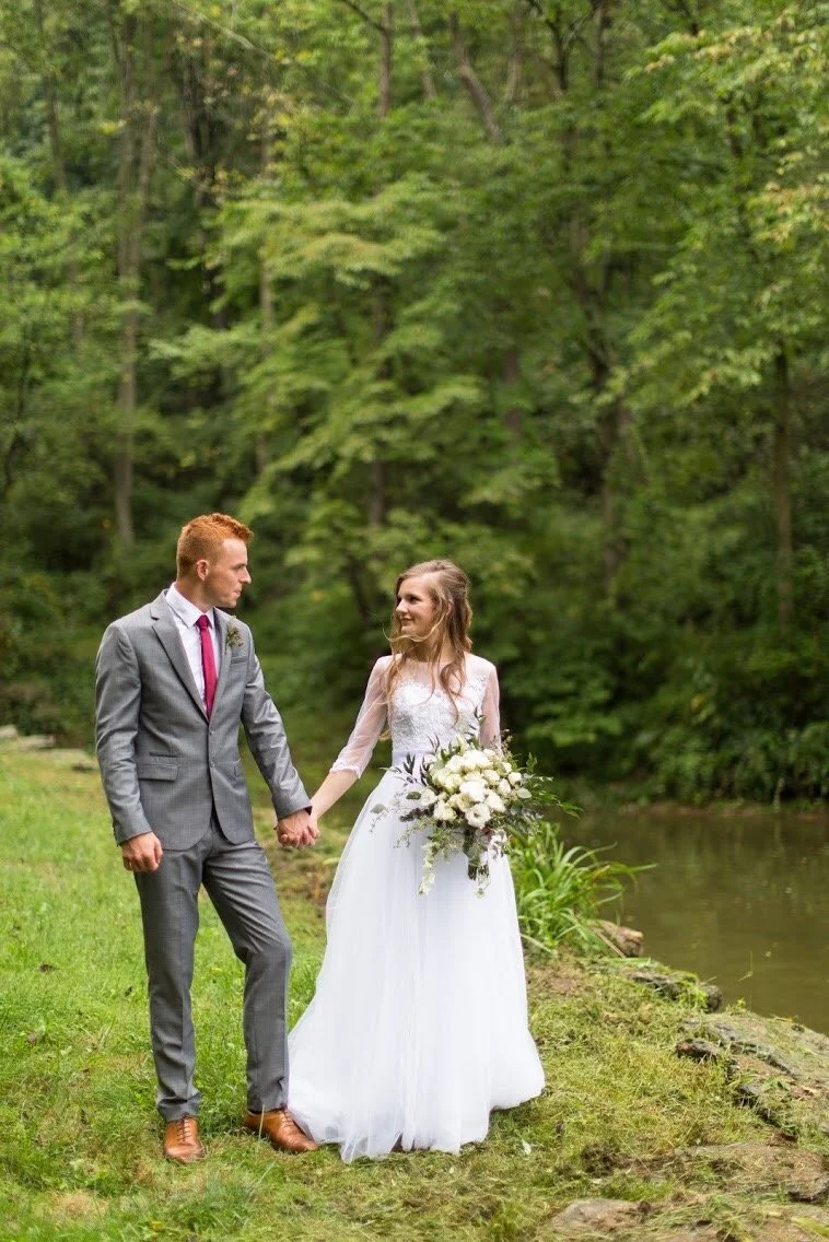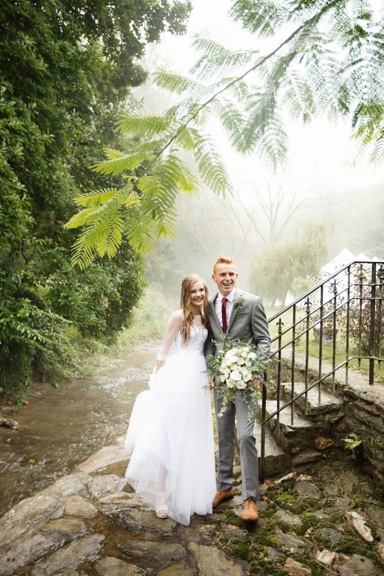 In front of a brook: there is nothing like the sound of a bubbling brook, what a beautiful sound to get married at. Just behind this couple’s officiant was the most beautiful stone-lined brook, which on this couple’s wedding day was quite bubbling due to the torrential rain.